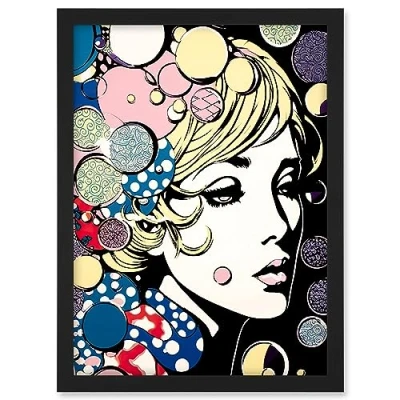 Artery8 Modern Woman Blonde Portrait Pop Art Bubbles Patterns Colourful Comic Book Halftone Artwork Framed A3 Wall Print