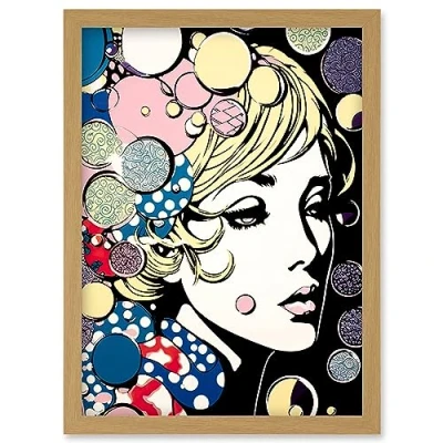 Artery8 Modern Woman Blonde Portrait Pop Art Bubbles Patterns Colourful Comic Book Halftone Artwork Framed Wall Print A4