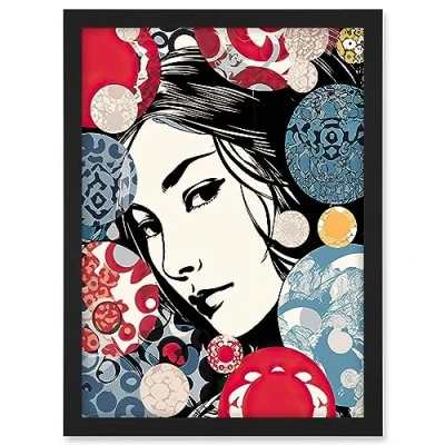 Artery8 Modern Woman Portrait Bubbles and Patterns Colourful Blue Red Pop Art Halftone Artwork Framed A3 Wall Print
