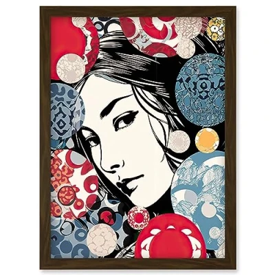 Artery8 Modern Woman Portrait Bubbles and Patterns Colourful Blue Red Pop Art Halftone Artwork Framed Wall Print A4