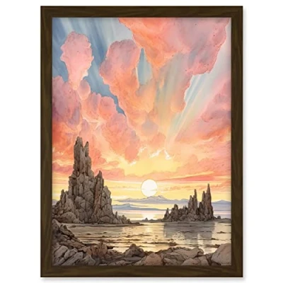 Artery8 Mono Lake Atmospheric Clouds at Dawn Break Modern Watercolour Painting Artwork Framed A3 Wall Art Print