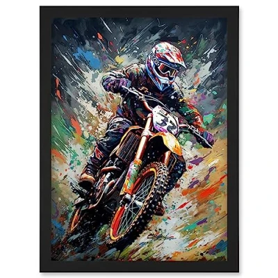 Artery8 Motocross Race Action Shot Paint Splat Portrait Artwork Framed Wall Art Print A4