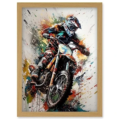 Artery8 Motocross Racer Paint Splat Action Shot Portrait Artwork Framed Wall Art Print A4