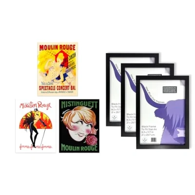 Artery8 Moulin Rouge Wall Art Set of 3 A4 Sized with Black Frames Burlesque Cabaret Girls Paris France Vintage Advertising