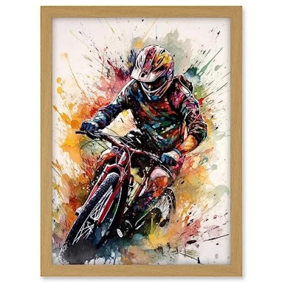 Artery8 Mountain Biker Action Shot Paint Splat Portrait Artwork Framed A3 Wall Art Print