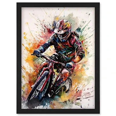 Artery8 Mountain Biker Action Shot Paint Splat Portrait Artwork Framed Wall Art Print A4