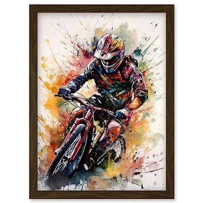 Artery8 Mountain Biker Action Shot Paint Splat Portrait Artwork Framed Wall Art Print A4