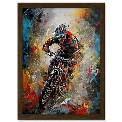 Artery8 Mountain Biker Paint Splat Action Shot Portrait Artwork Framed A3 Wall Art Print