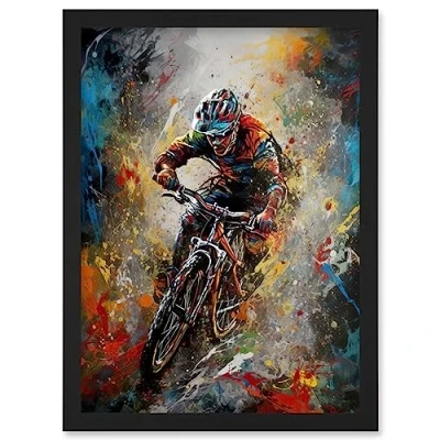 Artery8 Mountain Biker Paint Splat Action Shot Portrait Artwork Framed Wall Art Print A4