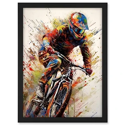 Artery8 Mountain Biker Portrait Splat Paint Action Shot Artwork Framed A3 Wall Art Print