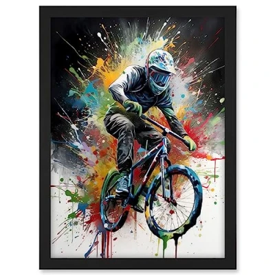 Artery8 Mountain Biking Extreme Sport Paint Splat Portrait Artwork Framed A3 Wall Art Print