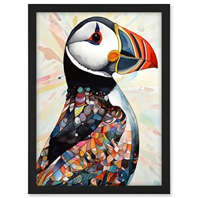 Artery8 Multicolour Pattern Feather Puffin Bird Folk Art Artwork Framed A3 Wall Print