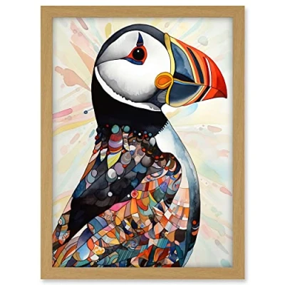 Artery8 Multicolour Pattern Feather Puffin Bird Folk Art Artwork Framed A3 Wall Print
