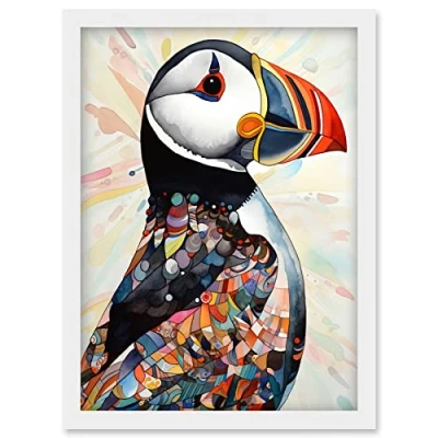 Artery8 Multicolour Pattern Feather Puffin Bird Folk Art Artwork Framed Wall Print A4