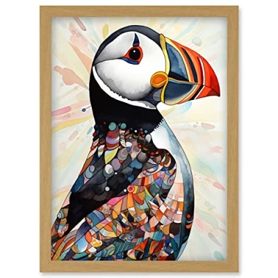 Artery8 Multicolour Pattern Feather Puffin Bird Folk Art Artwork Framed Wall Print A4
