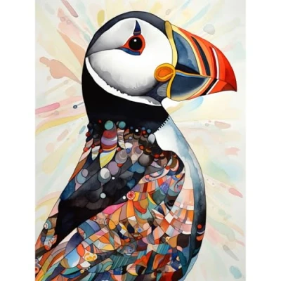 Artery8 Multicolour Pattern Feather Puffin Bird Folk Art Extra Large XL Wall Poster Print