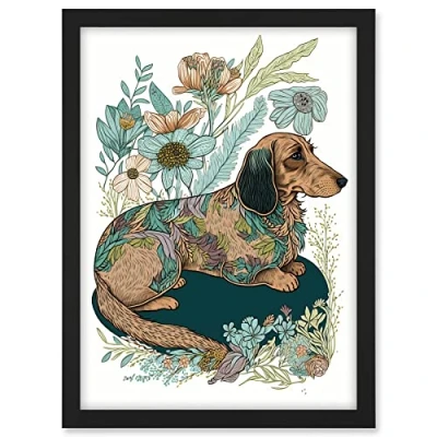 Artery8 Multicoloured Fur Dachshund Dog with Spring Flowers Modern Watercolour Illustration Artwork Framed A3 Wall Art Print