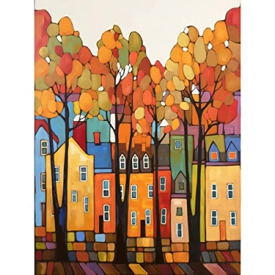 Artery8 Multicoloured House Street In Autumn Contemporary Folk Art Painting Large Wall Poster Print Thick Paper 18X24 Inch