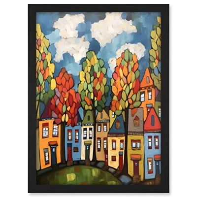 Artery8 Multicoloured Row Of Houses With Autumn Trees Contemporary Folk Art Painting Artwork Framed A3 Wall Print