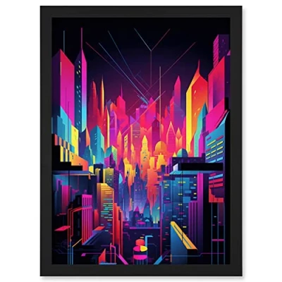 Artery8 Neon Light Colour Abstract Metropolis Cityscape at Night Modern Artwork Framed Wall Art Print A4