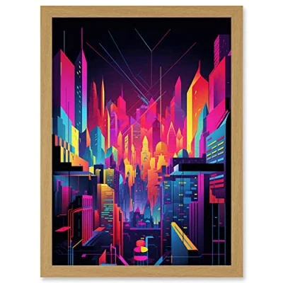 Artery8 Neon Light Colour Abstract Metropolis Cityscape at Night Modern Artwork Framed Wall Art Print A4