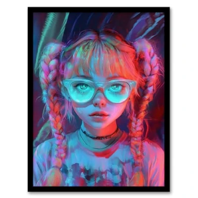 Artery8 Nerdy Girl Braid Pigtails Glasses Neon Pink Blue Living Room Artwork Framed Wall Art Print A4
