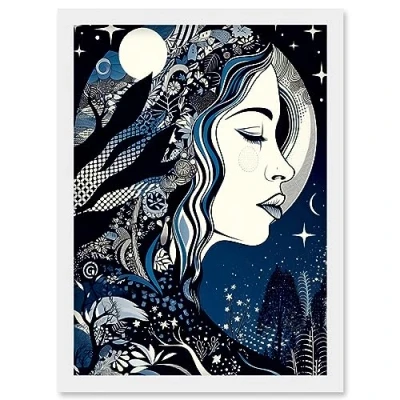 Artery8 New Moon Goddess Winter Moonlit Witchy Forest Starry Night Mother Nature Boho Patterns Artwork Framed Wall Art Print A4