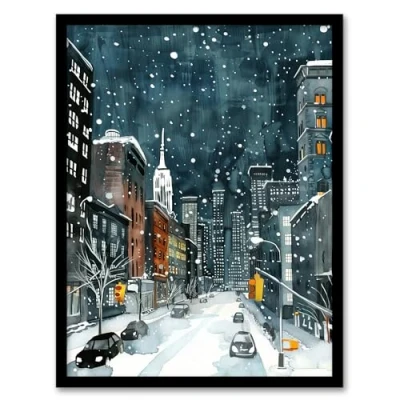 Artery8 New York City Street Winter Night Snow Cityscape Living Room Artwork Framed Wall Art Print A4
