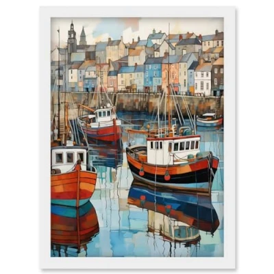Artery8 Newlyn Harbour Trawler Boats Promenade Watercolour Painting Cornwall Coastal Townscape Artwork Framed Wall Art Print A4