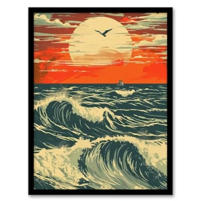 Artery8 Ocean Waves at Sunset Painting Seascape Bird Living Room Bathroom Artwork Framed Wall Art Print A4