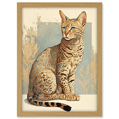Artery8 Ocicat Cat with Turquoise Rosette Pattern Fur Modern Watercolour Illustration Artwork Framed A3 Wall Art Print