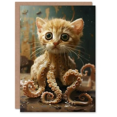 Artery8 Octokitten Cat Lover Octopus Tabby Kitten Hybrid Blank For Him Or Her Art Birthday Card