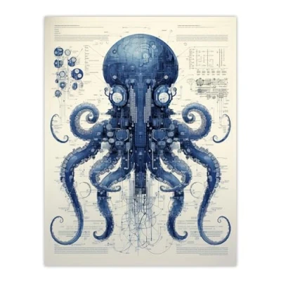 Artery8 Octopus Robot Hybrid Schematic Blueprint Futuristic Secret Complex Arcane Manuscript Gift For Him Man Cave Large Wall Art Poster Print Thick Paper 18X24 Inch