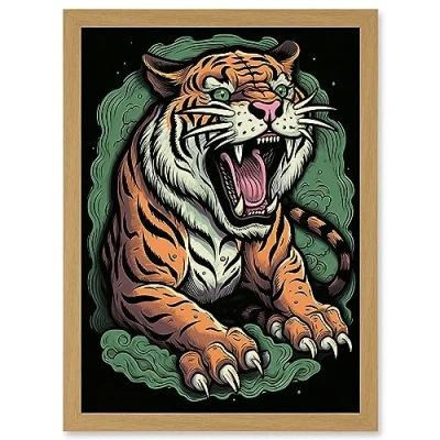 Artery8 Old School USA Tattoo Ink Body Art Ferocious Tiger Rockabilly Americana 50s Artwork Framed A3 Wall Print
