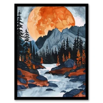 Artery8 Orange Harvest Moon Over Rocky Mountains Forest Living Room Artwork Framed Wall Art Print A4