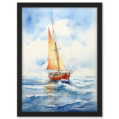 Artery8 Orange Sailing Boat Watercolour Painting Bathroom Artwork Sail at Sea Seascape Framed A3 Wall Art Print