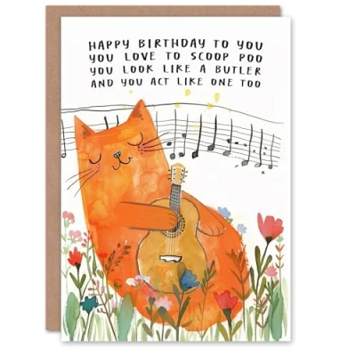 Artery8 Orange Tabby Guitar Song Cat Lover Floral Funny Blank For Him Or Her Art Birthday Card
