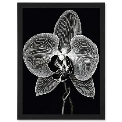 Artery8 Orchid Flower Bloom Black and White Blind Contour Artwork Framed A3 Wall Art Print