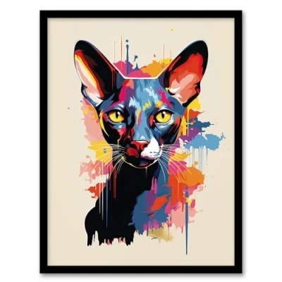 Artery8 Oriental Shorthair Cat Lover Gift Pet Portrait Orange Blue Pink Artwork Painting Framed Wall Art Print A4