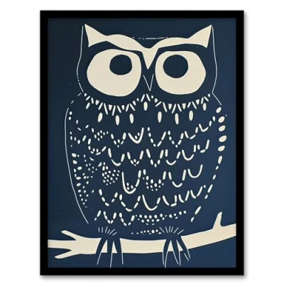 Artery8 Owl Bird Simple White Blue Block Print Design Living Room Artwork Framed Wall Art A4