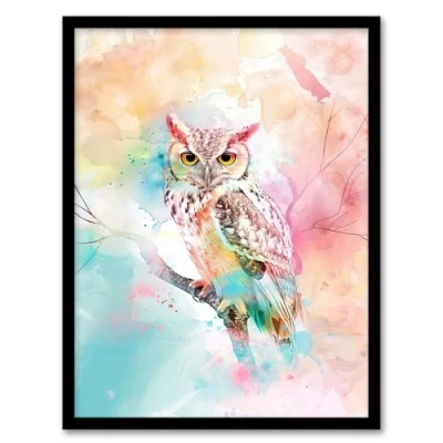 Artery8 Owl on Branch Portrait Pastel Rainbow Watercolour Living Room Artwork Framed Wall Art Print A4