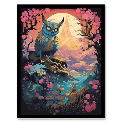 Artery8 Owl Yokai Concept Art Painting Mythical Folklore Creature Standing Before Warrior in a Cherry Blossom Forest Landscape at Sunset Artwork Framed Wall Print A4
