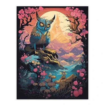 Artery8 Owl Yokai Concept Art Painting Mythical Folklore Creature Standing Before Warrior in a Cherry Blossom Forest Landscape at Sunset Large Wall Poster Print Thick Paper 18X24 Inch
