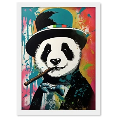 Artery8 Panda Bear Wearing Blue Top Hat Suit Smoking Cigar Artwork Framed A3 Wall Art Print