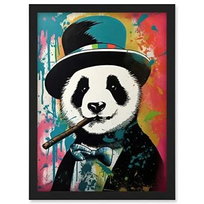 Artery8 Panda Bear Wearing Blue Top Hat Suit Smoking Cigar Artwork Framed Wall Art Print A4