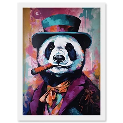 Artery8 Panda Portrait with Purple Suit Top Hat and Cigar Artwork Framed Wall Art Print A4
