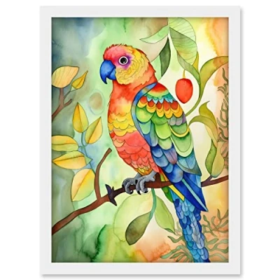 Artery8 Parrot Bird On Tree Branch Folk Art Watercolour Painting Artwork Framed A3 Wall Print