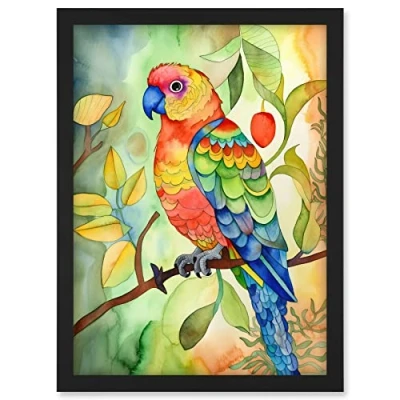 Artery8 Parrot Bird On Tree Branch Folk Art Watercolour Painting Artwork Framed A3 Wall Print