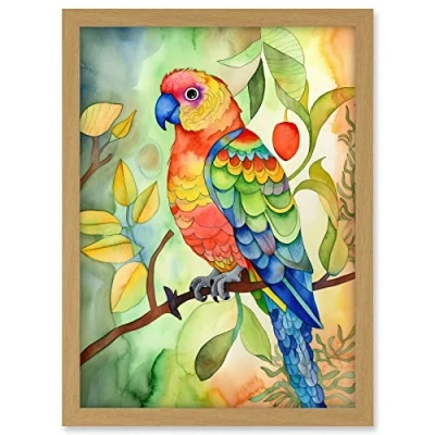 Artery8 Parrot Bird On Tree Branch Folk Art Watercolour Painting Artwork Framed A3 Wall Print
