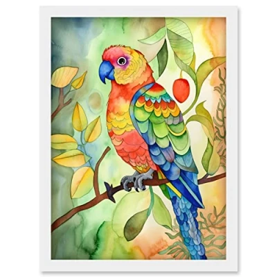 Artery8 Parrot Bird On Tree Branch Folk Art Watercolour Painting Artwork Framed Wall Print A4